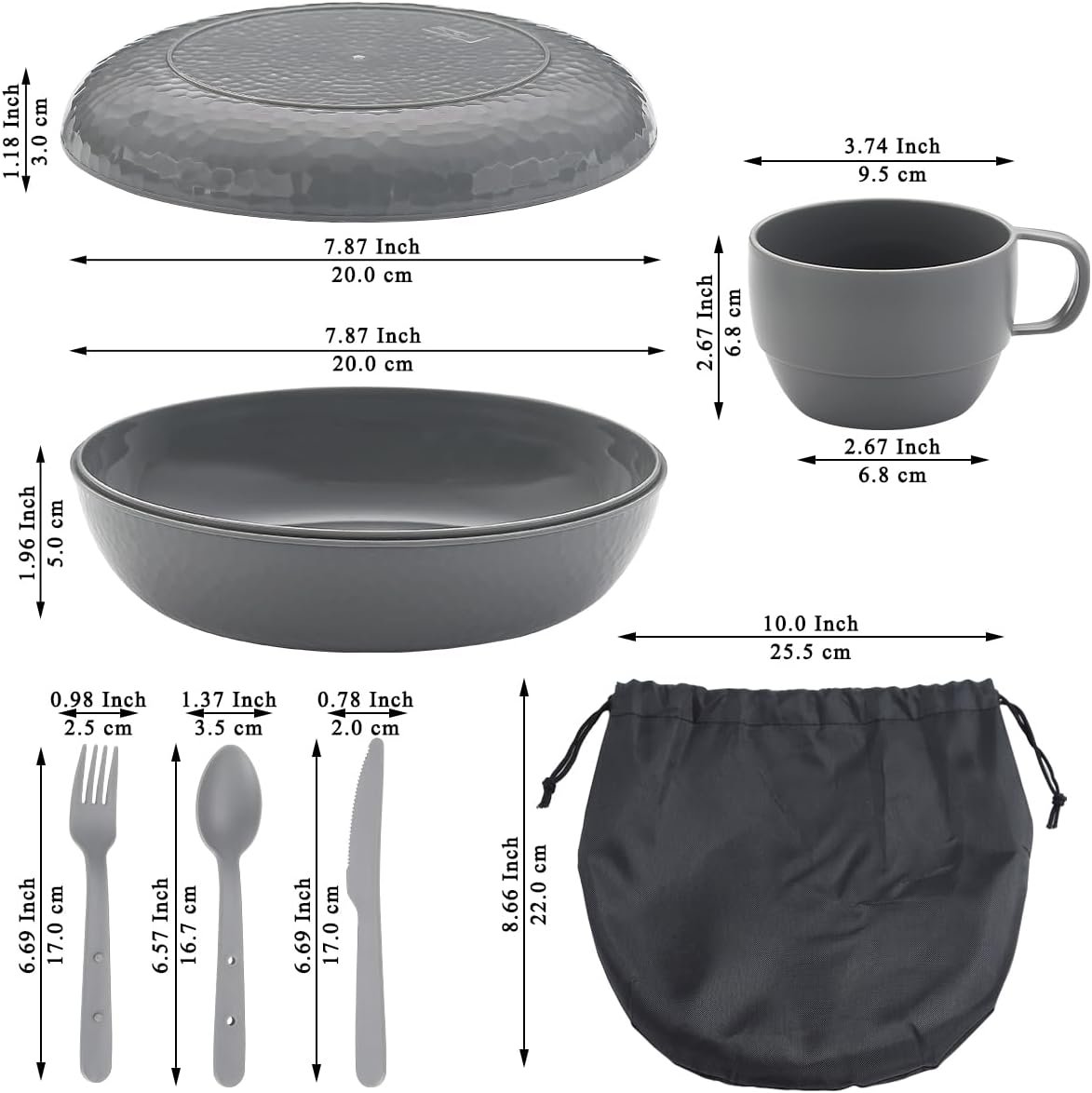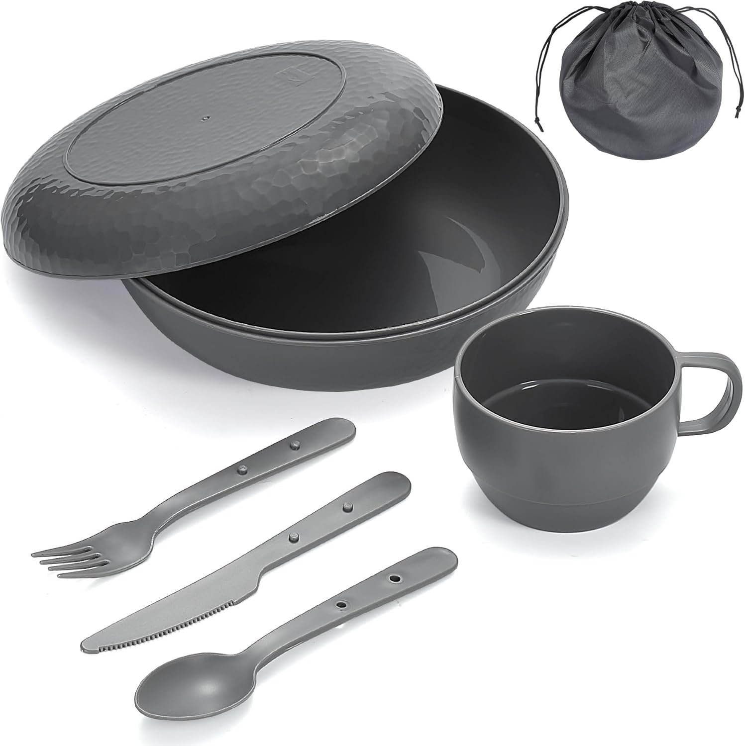 - 1. Space-Saving Design:The camping bowl and plate nest securely together, creating a compact base that neatly stores the cup and snap-together cutlery set. All items fit snugly into the included carry bag, reducing your pack size by over 50% for efficient packing.
